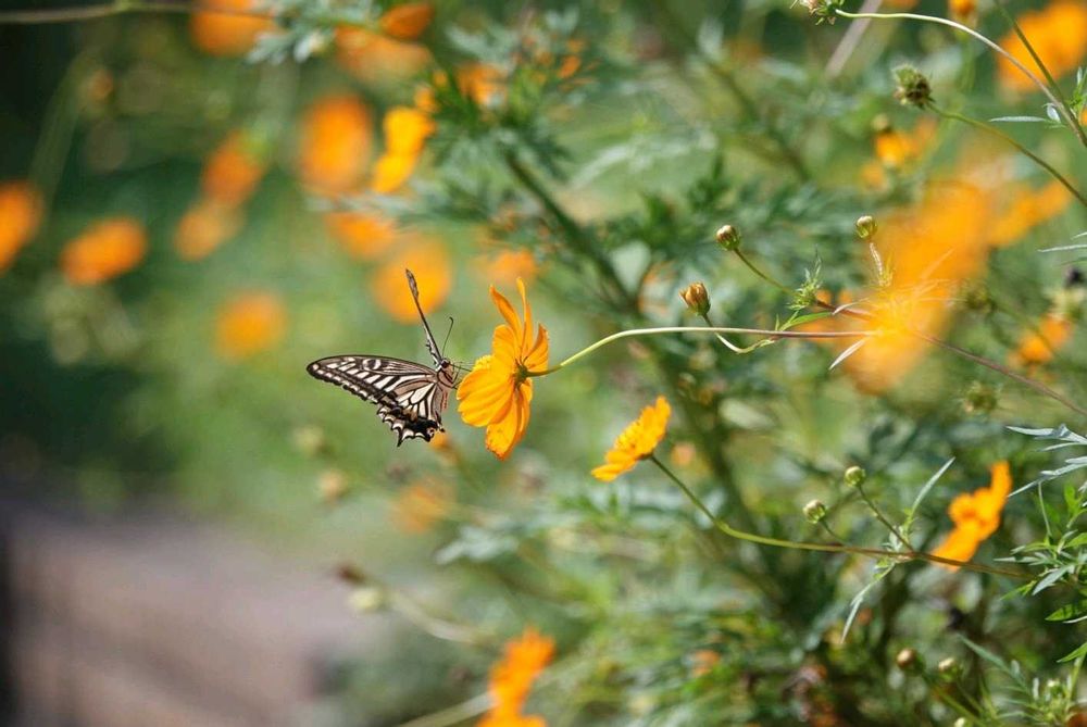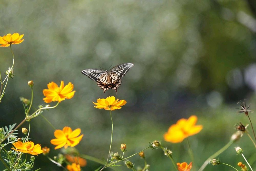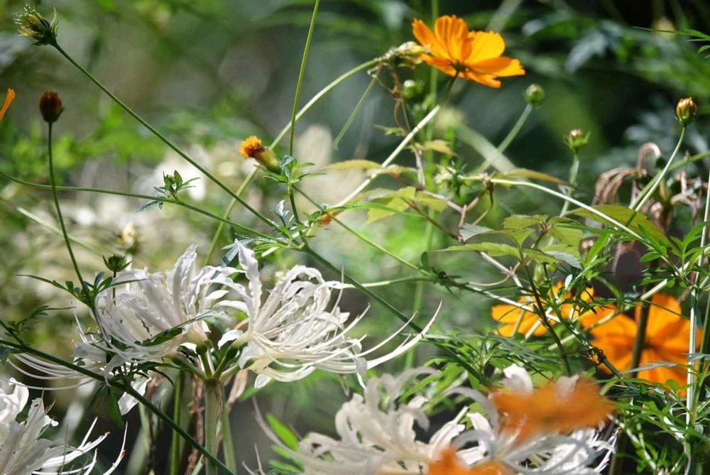 コスモス(秋桜) 斜面のコスモス畑は 悲しい位の開花、HPにも写真は載せられないと、管理の方のお話し。 何処も暑さに苦労された夏。 一頭のナミアゲハが コスモスを励ますように……(3、4枚目) 5枚目はこぼれ種から咲いたキバナコスモスと白いヒガンバナが入り乱れて咲く様がなんだか元気で嬉しくなりました!