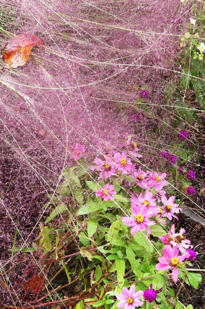 3つの植物が色合い、花の形状の違いが楽しく、美しい花壇。