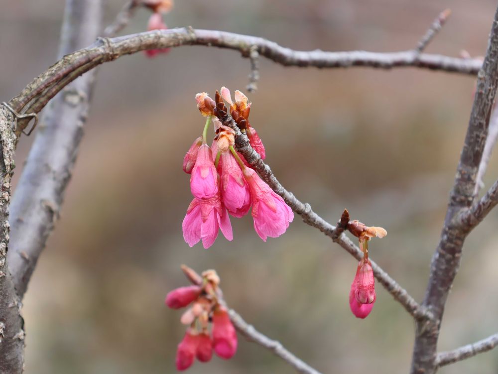カンヒサクラのつぼみも大きくなってきましたね! 濃いピンク色がよく目立ちます。