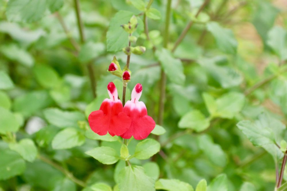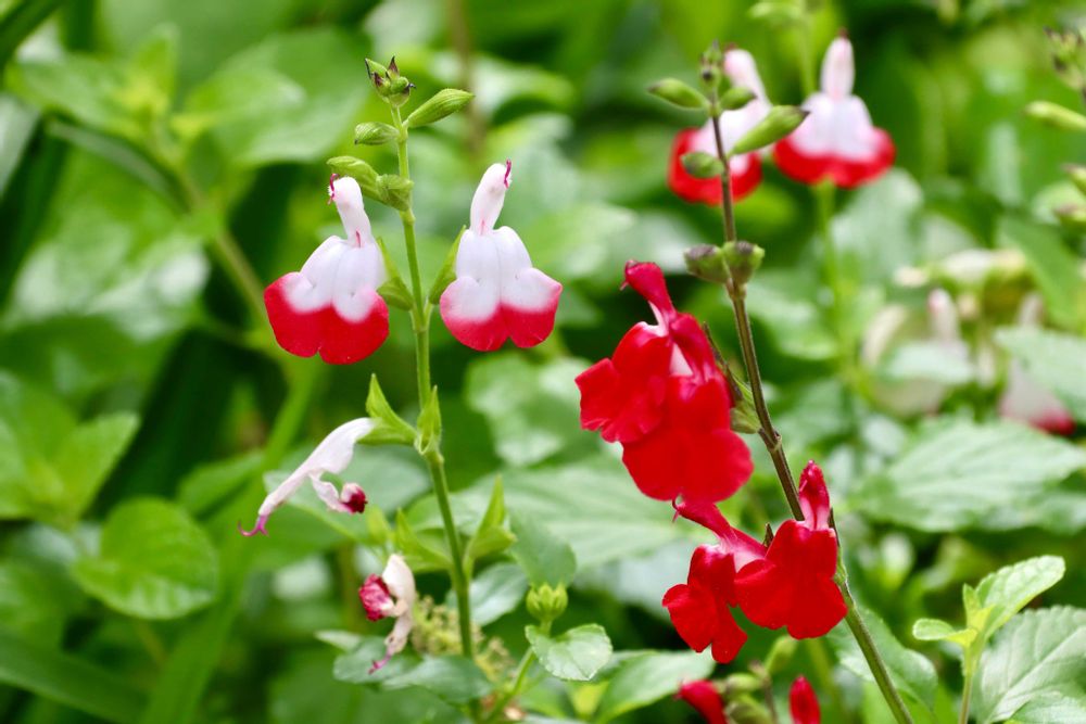チェリーセージ 「ホットリップス」 赤と白のバイカラー(2色)が特徴。葉っぱがチェリーの様な甘い香りがするので、「チェリーセージ」と名づけられたそうな🍒 気温の変化により花の色が変わるって知ってました?気温が低いと白の面積が増え、上がると赤一色になりやすいとか。 元町公園にて撮影📷