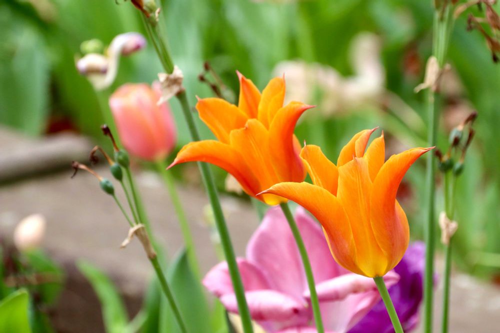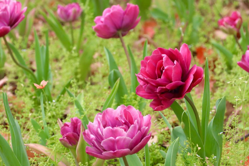 チューリップ (ユリ科) ①ゆり咲きチューリップ 「バレリーナ」 花弁の先端が尖っていて、外側に少し反り返る「ゆり咲き」の形状が特徴。 鮮やかなオレンジ色で、中央部が少し赤みを帯びるグラデーションが見られることも。チューリップでは珍しい甘い香りがするそうな。 ② 八重咲きチューリップ 花弁が幾重にも重なる華やかな形状。 一般的に4月〜5月上旬に見頃を迎える品種とか。 4月中旬に横浜公園にて撮影📷
