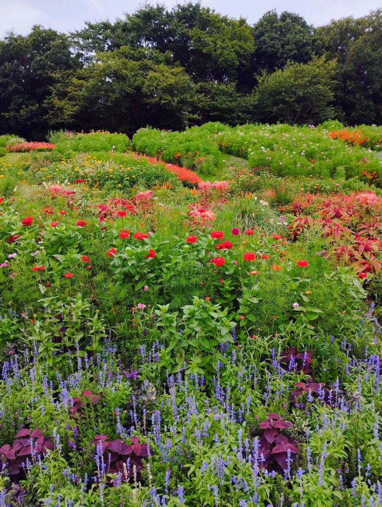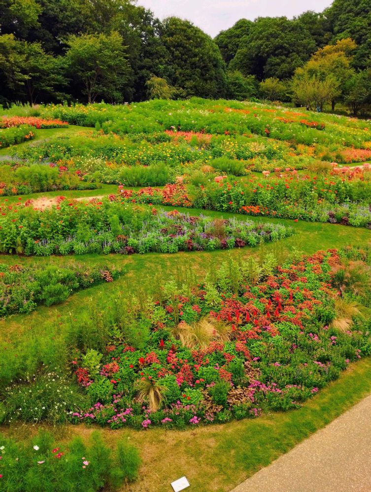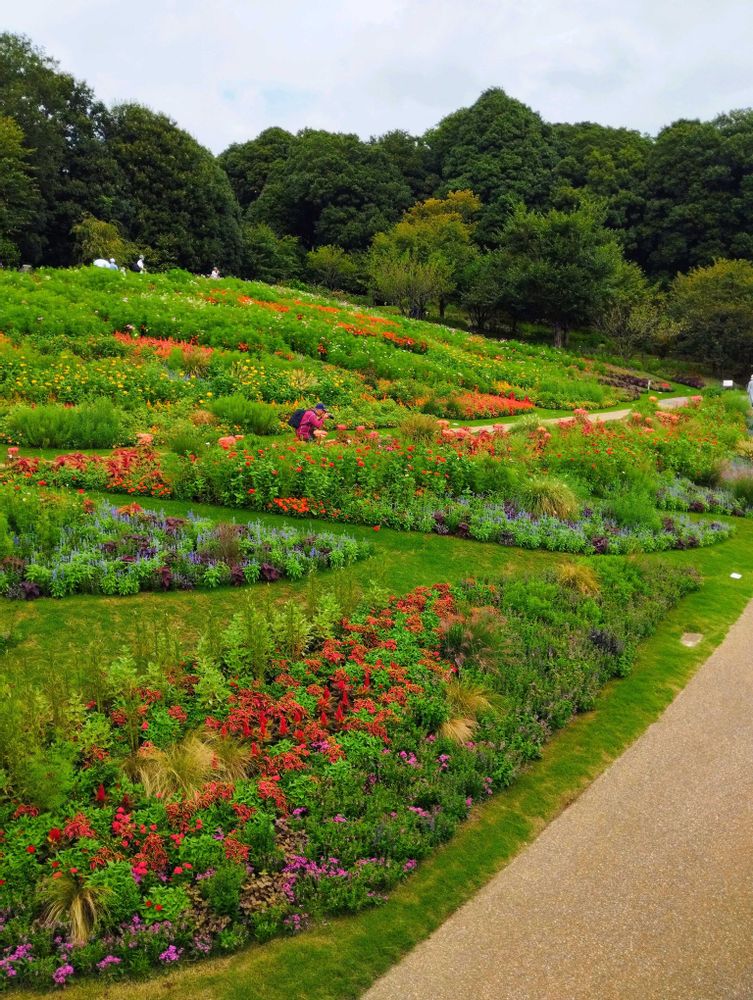 里山ガーデンフェスタ2025 大花壇のテーマ『夕焼け色の花壇』 暖色系の花色で今年はコスモスが綺麗に良く咲いてました🌼 初日の朝イチに撮影しました🖼️ NHK趣味の園芸に出演してます三上さんが居て、ちびっこ達と一緒に秋の寄植え制作をしてました。鉢にハロウィンのデコレーションをしてオリジナルの鉢にケイトウなど秋色の植物を植えてました。