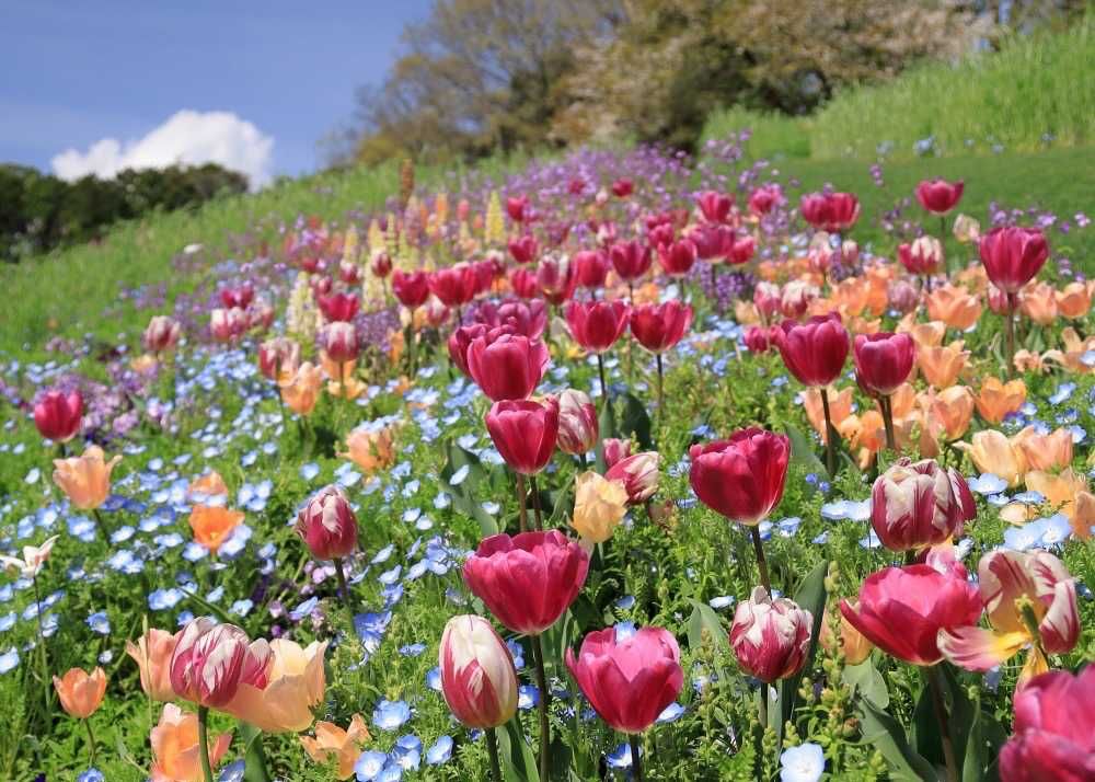 4月に入りしばらく同じ場所から撮った花畑を投稿しています。 色々な花畑があって右撮ったり左撮ったり、斜め上みたり見どころ満載でした。