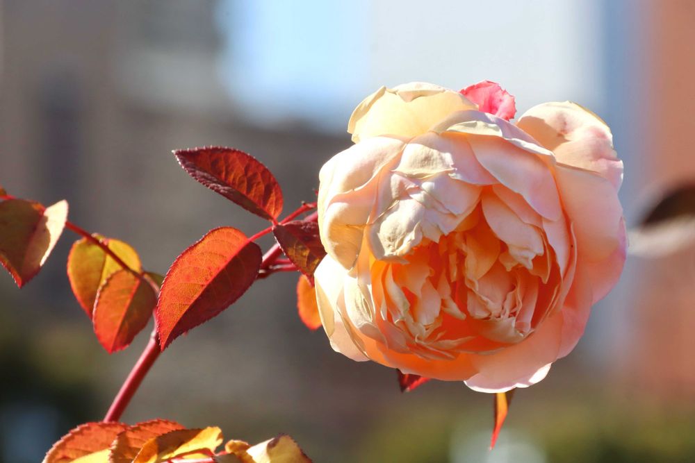 今日のお花 バラ 「レディ・エマ・ハミルトン」 (バラ科) 鮮やかなオレンジ色の花弁と対照的な銅色がかった色味の葉っぱが大きな特徴。形は丸味を帯びたカップ咲き。洋梨・グレープ・シトラスを合わせたようなフルーティーな強い香りがするとか。 山下公園にて撮影📷