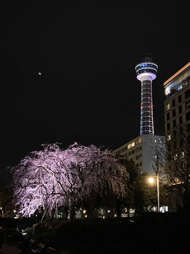 横浜山下公園の枝垂れ桜と 桜色のマリンタワー🌸