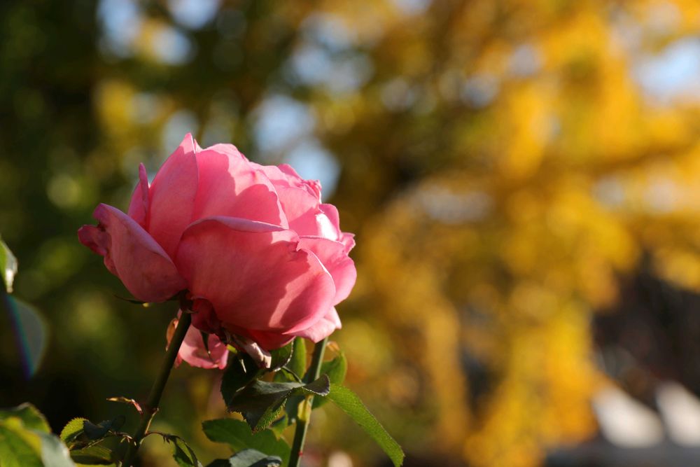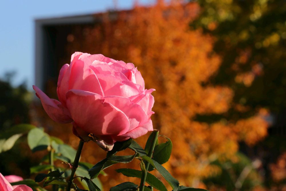 バラと紅葉。 バラの品種は「はまみらい」。横浜開港150周年記念のバラだそうです。 奥の紅葉は1枚目はイチョウ、2枚目はおそらくメタセコイヤです。